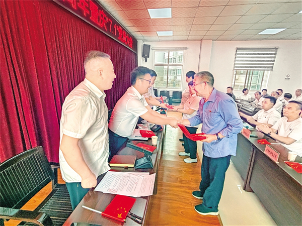 6月26日上午,嵐皋縣城關(guān)鎮(zhèn)西坡社區(qū)黨組織為黨齡滿50年的3名老黨員頒發(fā)“光榮在黨50年”紀念章,給每名參會黨員送上“政治生日賀卡”。魏代續(xù) 廖霖 攝