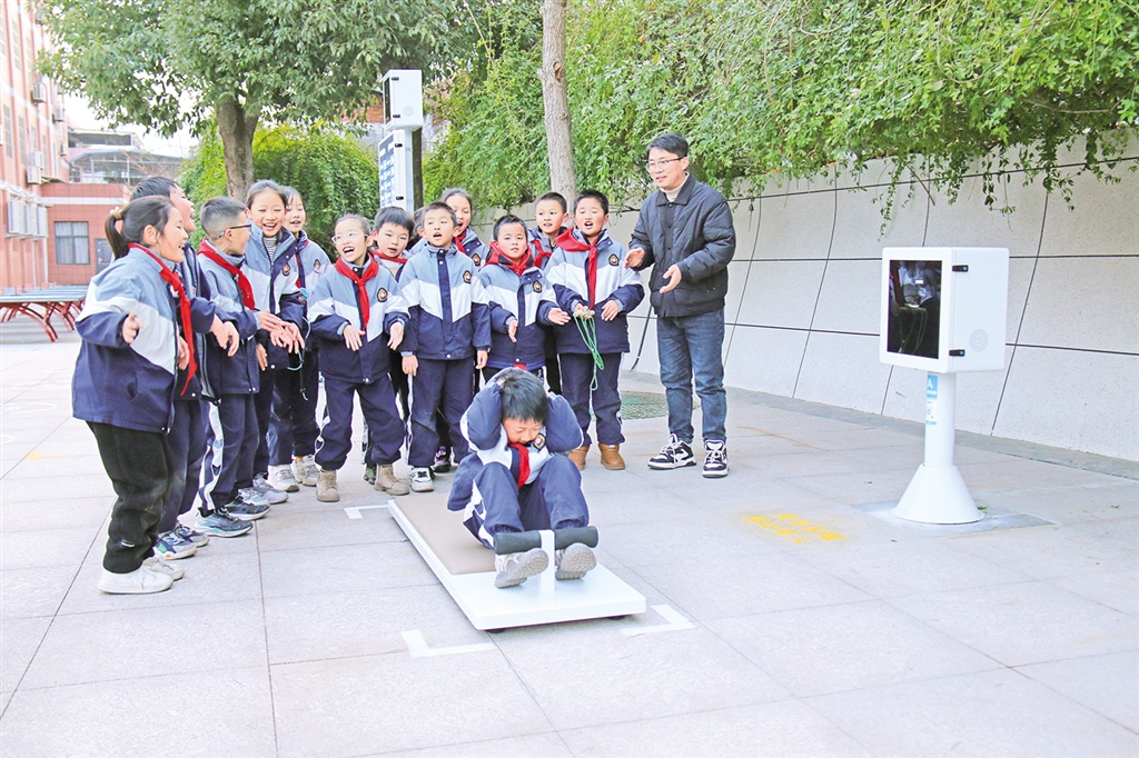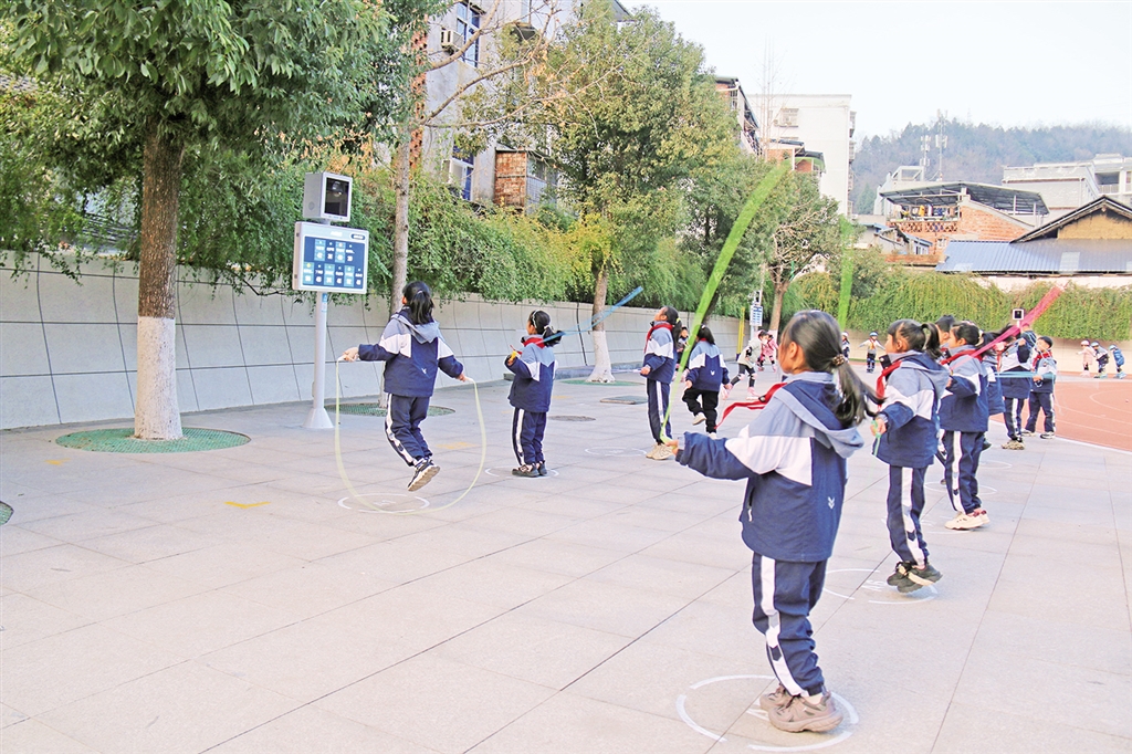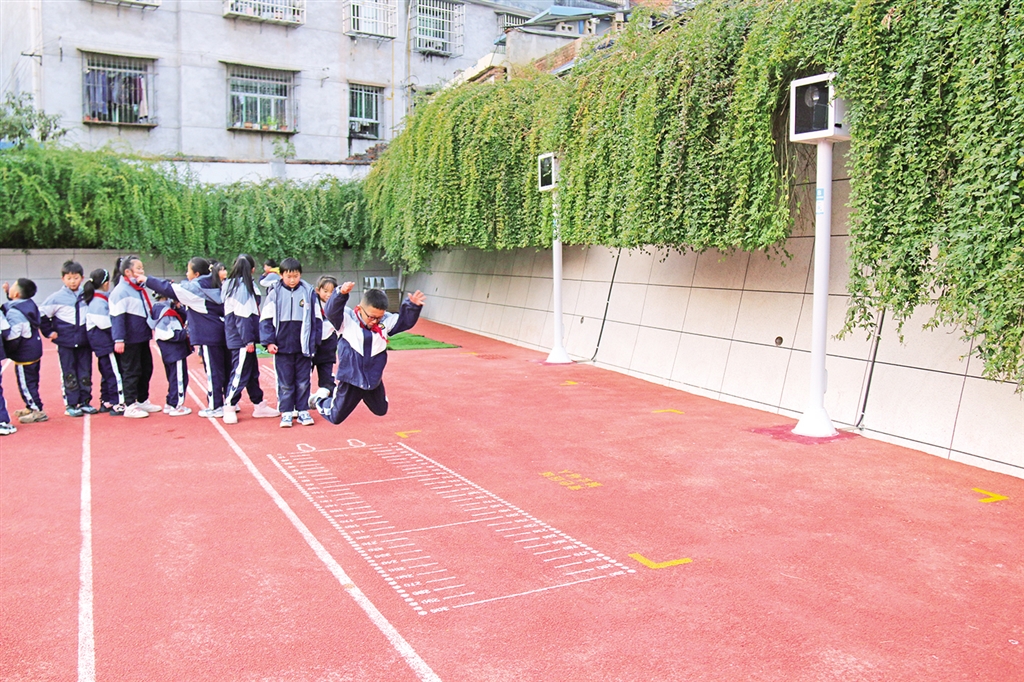 學(xué)生在AI智慧體育運動儀器感應(yīng)區(qū)內(nèi)跳繩。