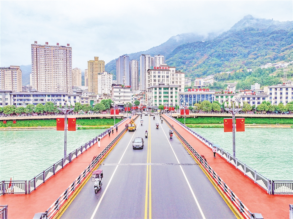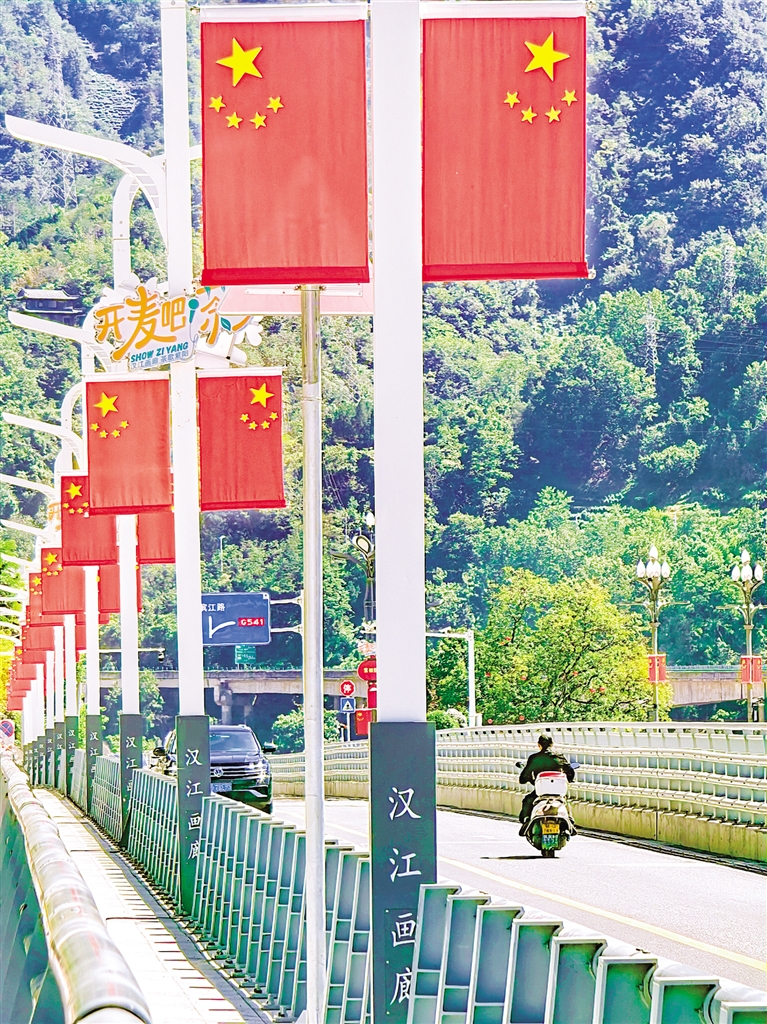 在嵐皋縣大橋兩側(cè),一面面整齊的五星紅旗迎風(fēng)飄揚(yáng),喜迎國慶。 李王灝 攝wxP安康新聞網(wǎng)