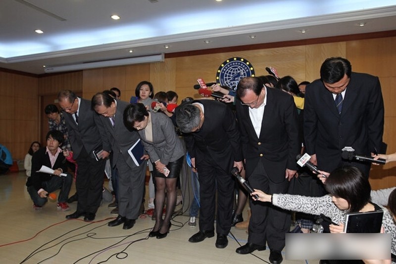 復(fù)興航空?qǐng)?zhí)行長(zhǎng)陳欣德2月4日下午率復(fù)航高層召開(kāi)記者會(huì),會(huì)前所有干部鞠躬道歉。陳欣德說(shuō),深深感到抱歉,致上十二萬(wàn)分歉意。圖為現(xiàn)場(chǎng)。ep2安康新聞網(wǎng)