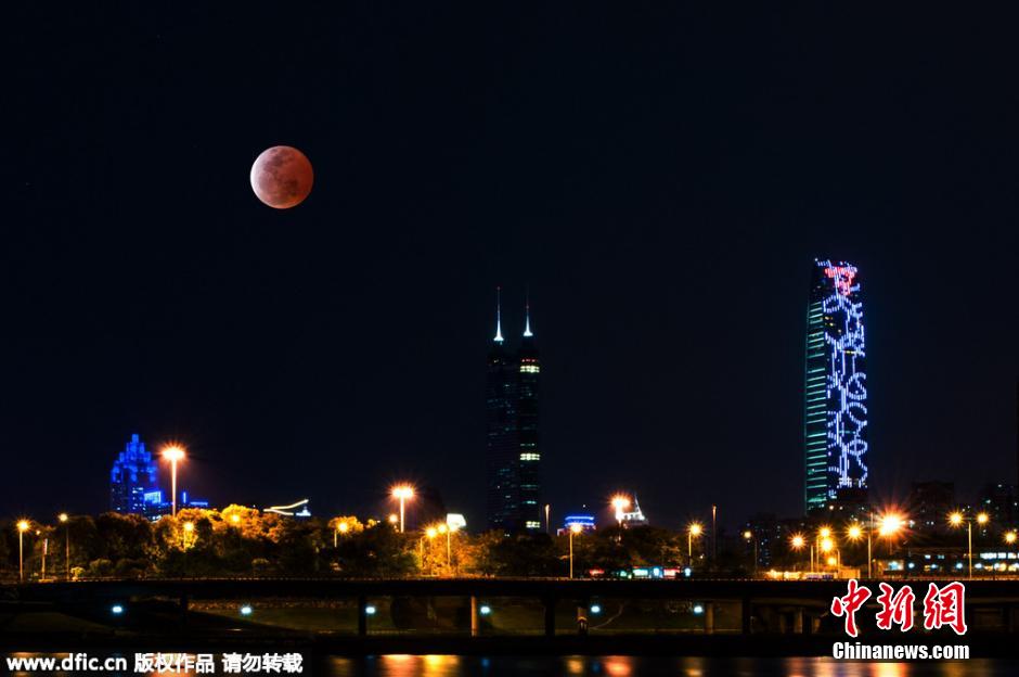 2015年4月4日,紅月亮現(xiàn)深圳夜空。(合成)鄧飛 攝