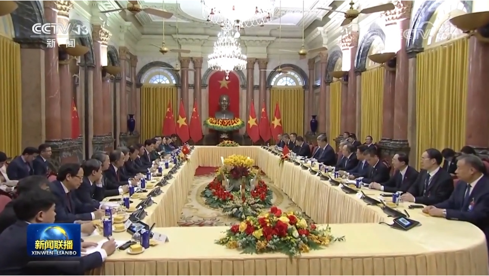 4月15日上午,中共中央總書(shū)記、國(guó)家主席習(xí)近平在河內(nèi)主席府會(huì)見(jiàn)越南國(guó)家主席梁強(qiáng)。