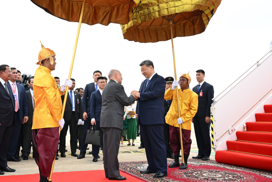 習近平乘專機抵達金邊國際機場時,西哈莫尼國王率夏卡朋親王、阿倫公主等王室成員,人民黨主席、參議院主席洪森,國會第一副主席錢業(yè)以及郭索帕、布拉索昆、韓春那洛、韶索卡、洪瑪尼等五位副首相在機場熱情迎接。禮兵分列紅毯兩側(cè)。柬埔寨王室珍娜公主向習近平獻上茉莉花手環(huán),女青年沿途向紅地毯拋撒花瓣。