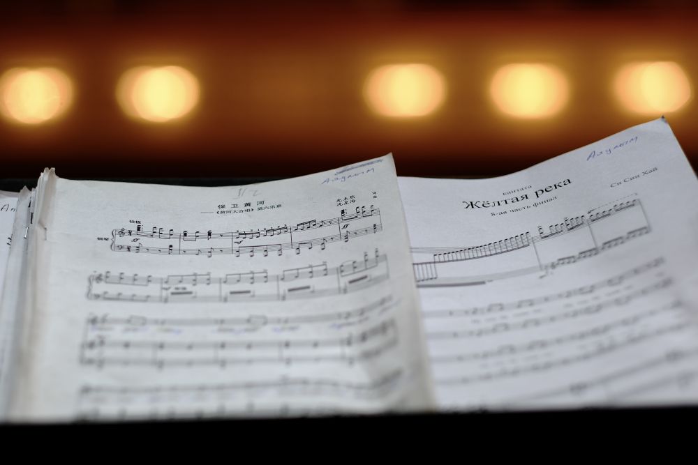 6月12日,在哈薩克斯坦阿拉木圖江布爾國(guó)家音樂(lè)廳拍攝的《黃河大合唱》中、俄文曲譜。新華社記者 鄭開君 攝