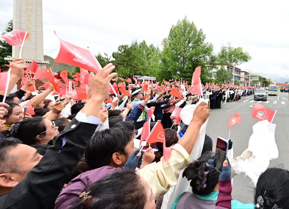 人群如潮水涌到道路兩旁,揮舞紅旗、手捧哈達(dá),高呼“扎西德勒”,聲聲祝福是“感恩總書記、感恩黨中央”的由衷表達(dá)。習(xí)近平總書記拉開車窗,微笑著向人群揮手致意。