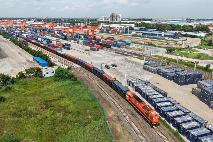 8月27日,一列貨運(yùn)列車(chē)駛?cè)胛挥谏虾鲜痉秴^(qū)內(nèi)的中國(guó)-上海合作組織地方經(jīng)貿(mào)合作示范區(qū)多式聯(lián)運(yùn)中心(無(wú)人機(jī)照片)。新華社記者李紫恒攝