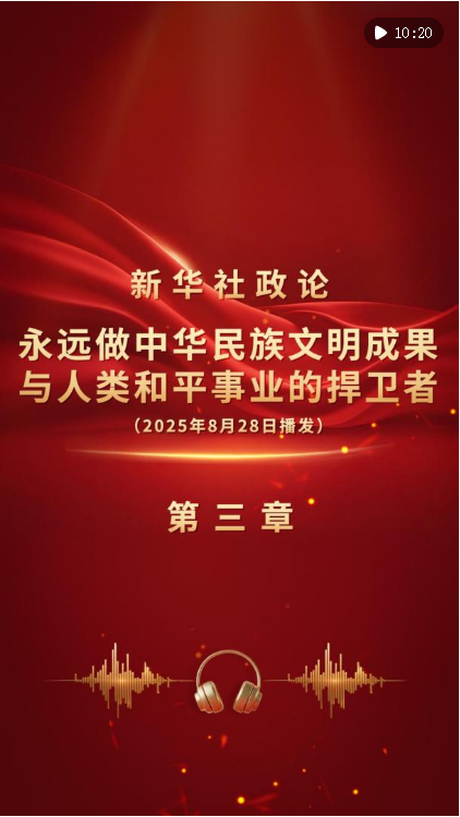 新華社8月28日播發(fā)《新華社政論|永遠(yuǎn)做中華民族文明成果與人類和平事業(yè)的捍衛(wèi)者——寫在中國人民抗日戰(zhàn)爭暨世界反法西斯戰(zhàn)爭勝利80周年之際》。我們邀請誦讀嘉賓吳樾演播“第三章”。