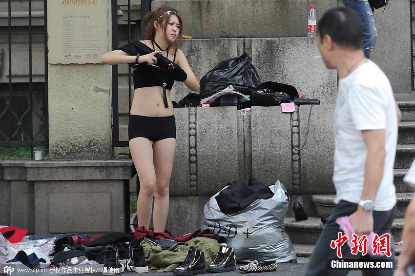 2015年9月4日,杭州中山中路一幢西式建筑外,幾名模特在街頭為網(wǎng)店拍攝秋冬服裝新品,為節(jié)省換裝時(shí)間,模特們淡定當(dāng)街脫掉衣服,只剩內(nèi)衣內(nèi)褲,迅速換上另一套服……