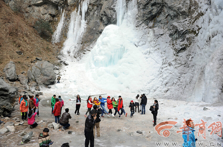 昨日下午2時(shí),游客在戶縣澇峪黑山瀑布前合影留念。不時(shí)有冰塊從瀑布上方掉落,著實(shí)讓人捏了一把汗 記者 趙彬 攝進(jìn)入冬季后,秦嶺72峪開始出現(xiàn)冰凍瀑布的奇觀,不……
