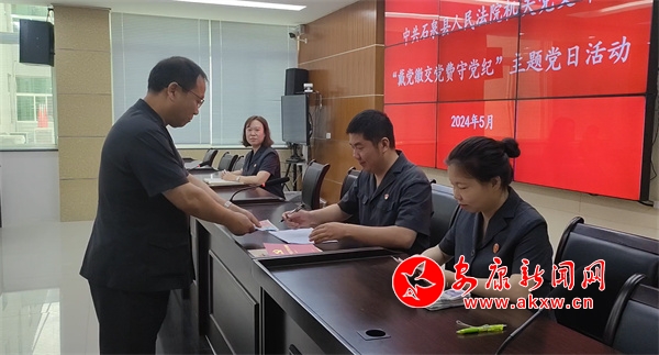 本網(wǎng)訊(通訊員 趙宇) 為進(jìn)一步強(qiáng)化黨員意識,增強(qiáng)黨員的歸屬感和榮譽(yù)感,近日,石泉法院組織開展“戴黨徽交黨費(fèi)守黨紀(jì)”主題黨日活動,院黨組書記、院長蔣曉安以普通黨員身份,帶頭繳納黨費(fèi)。