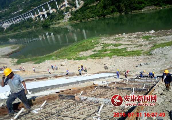 晏溝料場(chǎng)是旬陽水電站工程建設(shè)砂石料篩分基地,近30余萬方的渣土堆砌在漢江右岸,正值漢江主汛期,一旦遭遇漢江洪水,后果不堪設(shè)想,解決料場(chǎng)的防洪安全是保障水電站工程建設(shè)的關(guān)鍵。當(dāng)?shù)卣徒ㄔO(shè)單位精心組織,拼搶施工,重點(diǎn)對(duì)臨江200余米長、40余米高的料場(chǎng)截面采用混泥土面板防護(hù)工程措施,經(jīng)過一周時(shí)間的連續(xù)奮戰(zhàn),提前4天順利完成江岸料場(chǎng)防護(hù)工程節(jié)點(diǎn)任務(wù)。