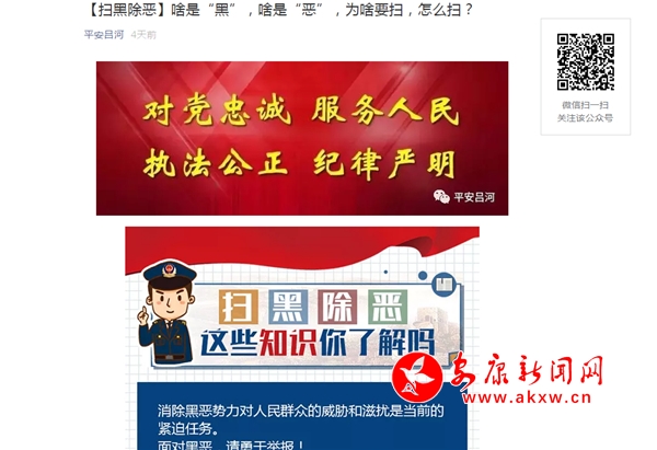 群眾“分段式”宣傳。根據(jù)轄區(qū)群眾各年齡段情況采取讓該年齡段人群容易接受的宣傳方式。對于年齡在20歲至45歲之間的年輕群體,依托各村警務(wù)群、“平安呂河”微信公眾平臺和“呂河警務(wù)聯(lián)動平臺”微信朋友圈等新媒體不斷推送“掃黑除惡”專項斗爭法律知識。對于年齡在45歲以上的人群,專門開通了短信平臺,實行“點對點”宣傳,形成了宣傳“全覆蓋”。
