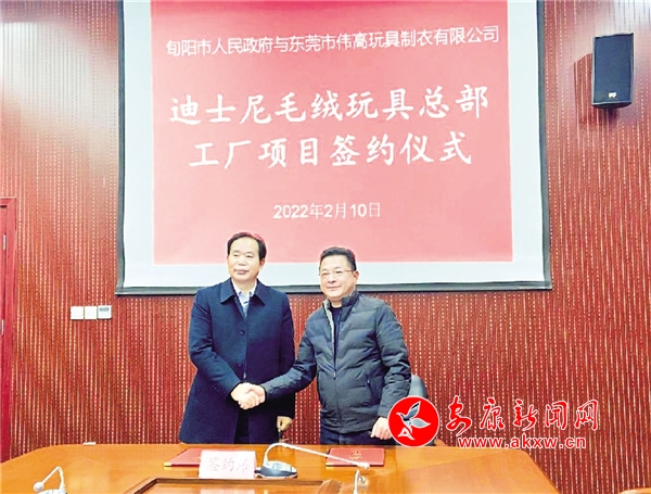 旬陽市委副書記、代市長羅本軍(左一)出席迪士尼毛絨玩具總部工廠項目簽約儀式