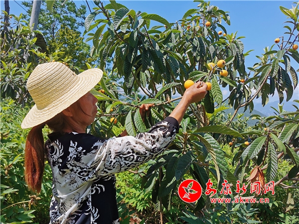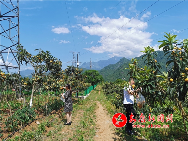 果農(nóng)們正忙著采摘、包裝、發(fā)運(yùn),臉上寫滿了豐收的喜悅。果農(nóng)楊作芳正在地里采摘枇杷,只見她左手挎著果籃,右手抓住枝丫,熟練地將一顆顆枇杷摘下來,看到品相特別好的,她就拿起來展示一下,“你看這幾顆又大又圓,熟透了,絕對特別甜。”她從2016年開始流轉(zhuǎn)自己的土地給合作社種植枇杷,總共種了16畝。“今年的枇杷剛剛成熟,掛果比去年還多。我摘一天給我發(fā)100元工資,枇杷一斤可以賣到10塊錢,等枇杷都賣了,我能穩(wěn)穩(wěn)賺到4萬多呢。”剛從地里采摘完枇杷正在裝箱的楊作芳談及枇杷給她帶來的收益樂開了花。在枇杷園內(nèi)除了果農(nóng)外,也引得不少游人前來觀光采摘。