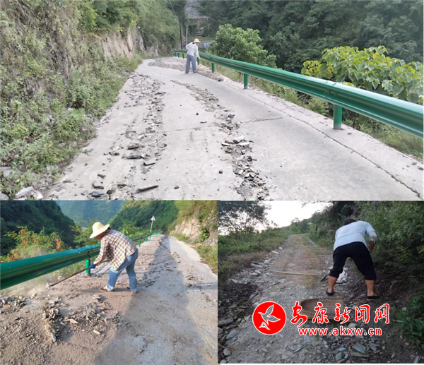 6月下旬,一場暴雨來襲,緩解旱情的同時(shí),又將三組陽在梁(小地名)的通組主干道沖擊損毀,這不僅使三組村民出行困難,更是阻斷了金銀花外銷的交通道路。得知這一情況后,市司法局駐村工作隊(duì)和村“兩委”立即組織公益崗對道路進(jìn)行自救修復(fù)。
