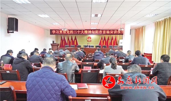 黨的二十大為新時代新征程黨和國家事業(yè)發(fā)展、實現(xiàn)第二個百年奮斗目標擘畫了發(fā)展藍圖、規(guī)劃了實踐路徑、作出了戰(zhàn)略部署。旬陽市委第一時間召開會議、印發(fā)通知,要求全市各級黨組織和廣大黨員把學習宣傳貫徹黨的二十大精神作為當前和今后一個時期的重大政治任務(wù),迅速興起學習熱潮。去年10月24日以來,市委先后召開6次會議集中學習黨的二十大精神,10月28日,全市黨員干部學習黨的二十大精神集中培訓會順利召開,11月22日,旬陽市黨的二十大精神宣講工作全面啟動,市委書記陳紅星在城關(guān)鎮(zhèn)開展黨的二十大精神首場宣講,以上率下做好宣講“頭等大事”。市委書記的帶頭宣講宛如一聲“發(fā)令槍”,引領(lǐng)全市宣講不斷走深走實。隨后,其他市級領(lǐng)導(dǎo)、各鎮(zhèn)黨委書記和市直部門主要負責同志,均深入基層或在分管領(lǐng)域、本單位本系統(tǒng)開展宣講90余場次,切實推動黨的二十大精神進黨政機關(guān)、進企事業(yè)單位、進城鄉(xiāng)社區(qū)、進校園課堂、進各類新經(jīng)濟組織和新社會組織。