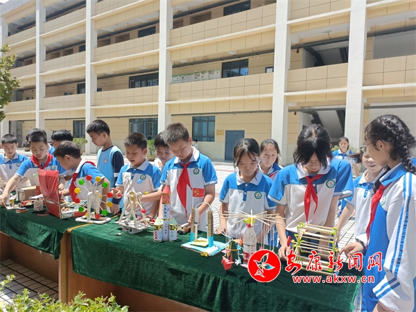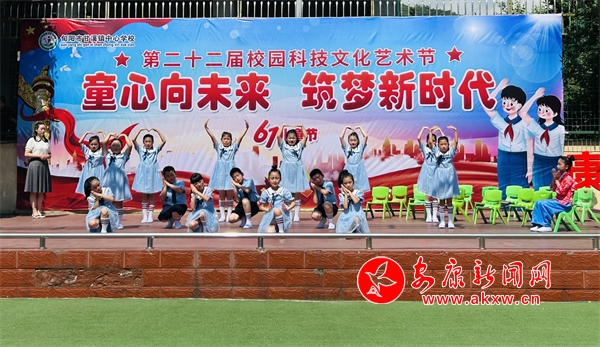 舞臺中央“童心向未來,筑夢新時代”一行醒目的紅色標題映入眼簾。少先隊員納新儀式上,黨員教師和輔導(dǎo)員老師共同為新入隊的孩子們佩戴上鮮艷的紅領(lǐng)巾,新隊員們在大隊輔導(dǎo)員的帶領(lǐng)下莊嚴地宣誓。各班、各社團精心編排的文藝節(jié)目依次上演,精彩的節(jié)目引起陣陣歡呼,掌聲響成一片。隨后,還組織了學(xué)生書畫和科技小制作展覽,大家不時駐足觀看,燦爛的笑容匯成校園里一道亮麗的風(fēng)景。