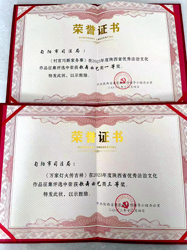 本網(wǎng)訊(通訊員 黃倩) 近日,陜西省委普法辦通報了2023年度全省優(yōu)秀法治文化作品獲獎名單,共評出5類132件獲獎作品,其中由旬陽市司法局選送的原創(chuàng)普法民歌劇《村官巧斷家務事》和漢調(diào)二黃歌舞《萬家燈火傳吉祥》分別榮獲歌舞曲藝類一等獎、三等獎。