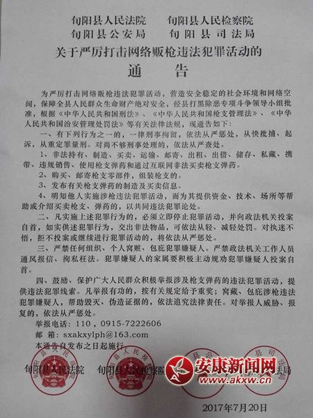 安康新聞網(wǎng)訊(通訊員 祝康)7月20日,旬陽(yáng)警方聯(lián)合法、檢、司部門(mén)共同發(fā)布了《關(guān)于嚴(yán)厲打擊網(wǎng)絡(luò)販槍違法犯罪活動(dòng)的通告》。從該縣警方了解到,發(fā)布此次《通告》……